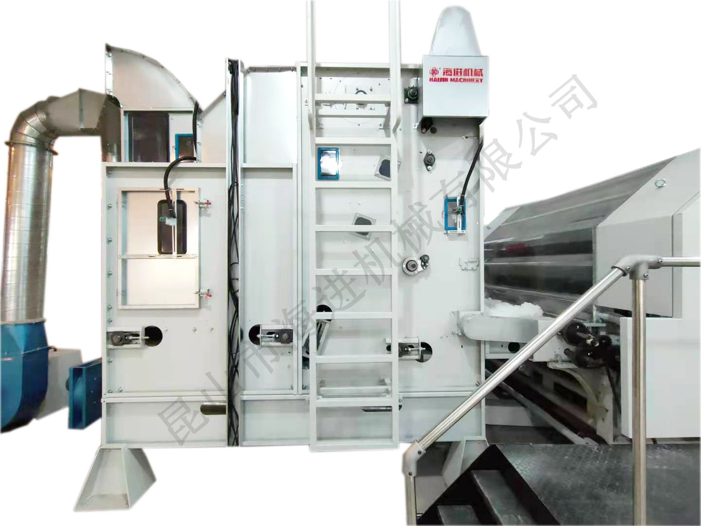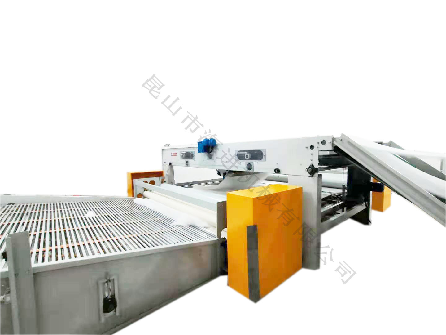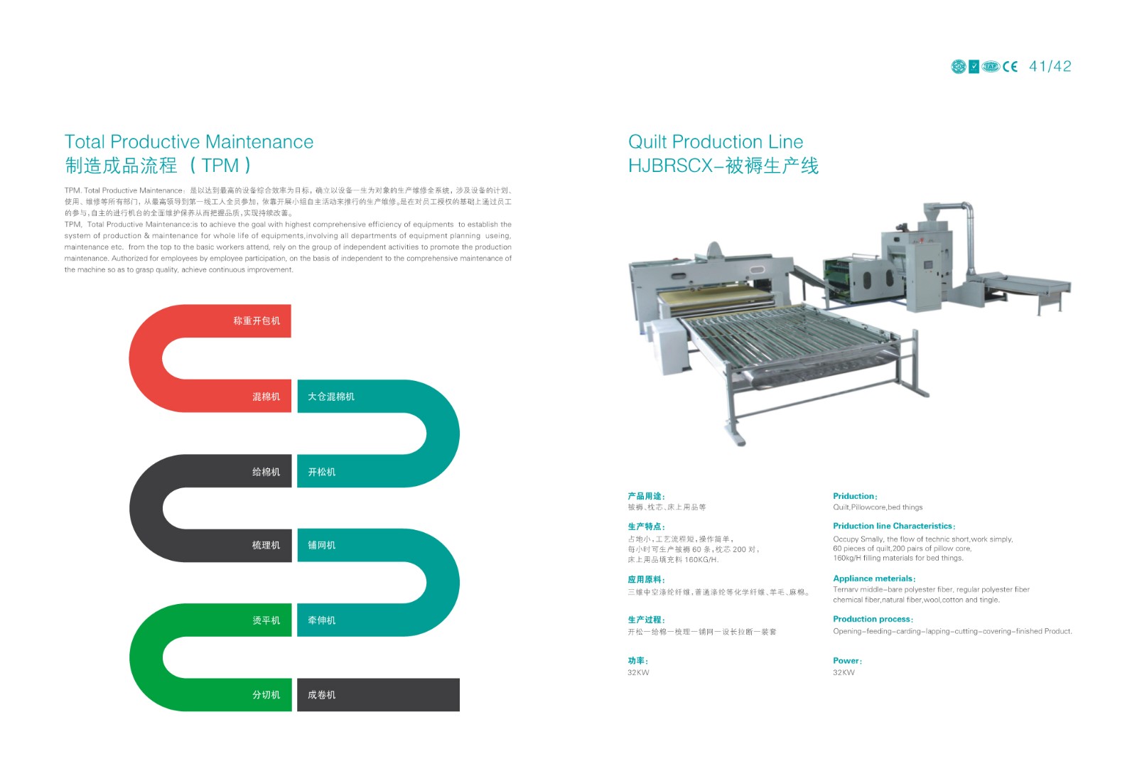 本生產(chǎn)線專為化纖填充被套的自動化生產(chǎn)設(shè)計,涵蓋從纖維梳理、填充物鋪網(wǎng)到被套封裝的全流程,具有高效、精準、衛(wèi)生等特點,適用于家紡、酒店用品、醫(yī)療寢具等領(lǐng)域的大規(guī)模生產(chǎn)。 化纖原料預(yù)處理 原料開松:將壓縮的化纖塊(如滌綸、PP棉等)通過開松機打散,形成蓬松狀態(tài)。 纖維梳理:通過高速梳理機將纖維梳理成均勻的網(wǎng)狀結(jié)構(gòu),確保填充物無結(jié)塊、厚度一致。 填充物鋪網(wǎng)與定型 交叉鋪網(wǎng)機將梳理后的纖維多層疊加,調(diào)節(jié)克重和蓬松度。 短程熱風(fēng)定型(可選):通過低溫熱風(fēng)穩(wěn)定纖維結(jié)構(gòu),增強回彈性。 被套裝配與封裝 自動裁切:按預(yù)設(shè)尺寸切割填充層,匹配被套外殼。 充填裝套:通過充填機將纖維層均勻填入預(yù)制的被套外殼,避免分布不均。 絎縫/封口:采用多針絎縫機固定填充物,或通過超聲波封口機完成密封(防螨抗菌需求場景)。 質(zhì)檢與包裝 重量檢測:確保每床被子填充量符合標準。 金屬探測:排除生產(chǎn)過程中可能的金屬雜質(zhì)。 自動折疊包裝:真空壓縮(可選)后裝箱。 高效率:全自動化流程,日產(chǎn)量可達2000~5000床(視規(guī)格而定)。 精準控制:PLC系統(tǒng)調(diào)節(jié)填充量、絎縫間距等參數(shù),誤差≤2%。 衛(wèi)生環(huán)保:封閉式填充環(huán)節(jié)減少粉塵污染,支持可回收化纖材料。 靈活適配:可快速切換不同被套尺寸(單人/雙人/加大)和填充克重。 智能分揀系統(tǒng):聯(lián)動MES系統(tǒng)實現(xiàn)訂單批次管理。 抗菌處理模塊:在線噴涂抗菌劑(適用于醫(yī)療、兒童用品)。生產(chǎn)線概述